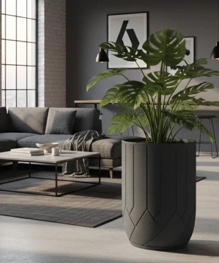 Fabricada en polietileno rotomoldeado, liviano, resistente a impactos y a los rayos UV. Superficie con textura suave tipo cemento, de aspecto natural y elegante.