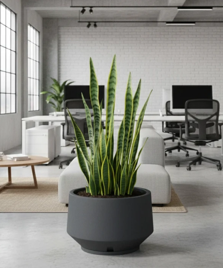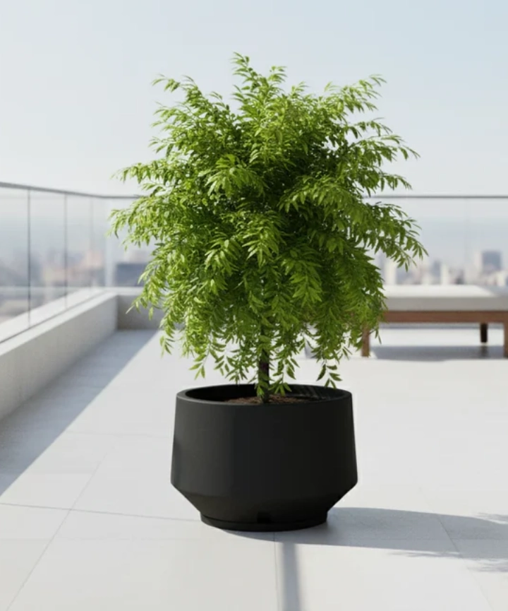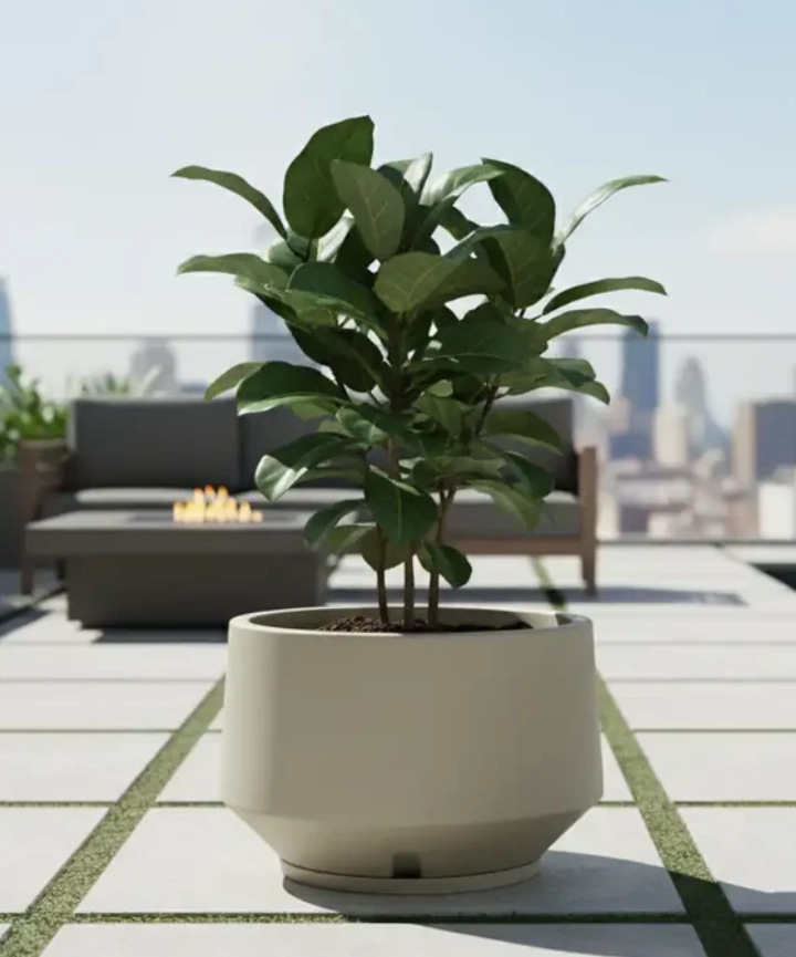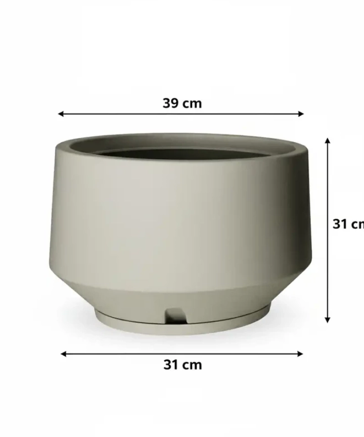 Fabricada en polietileno rotomoldeado, liviano, resistente a impactos y a los rayos UV. Superficie con textura suave tipo cemento, de aspecto natural y elegante.