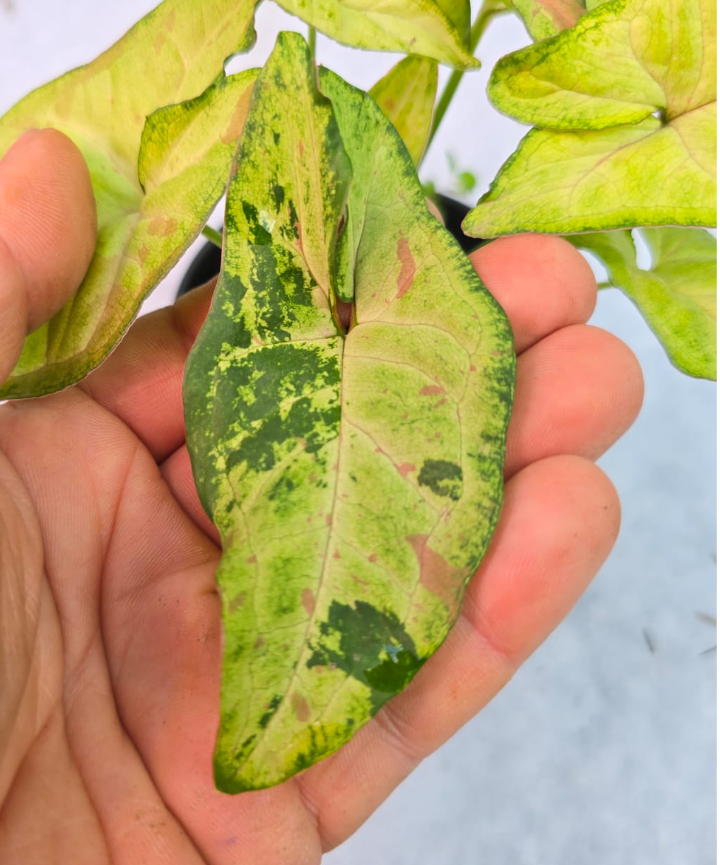 Si amás los syngonios, esta variedad es una joyita alegre: el Confetti Tricolor combina tonos verde claro, crema y rosa que parecen pinceladas sobre cada hoja. Ninguna es igual a otra, lo que lo vuelve una pieza especial en cualquier rincón interior. En Peppo lo cuidamos desde su llegada, listo para que florezca con vos.