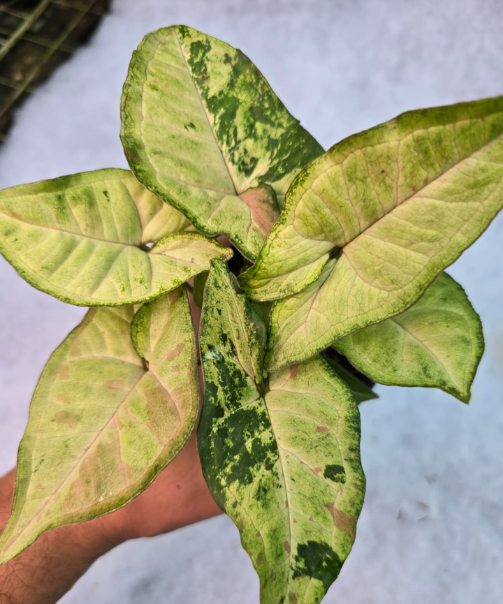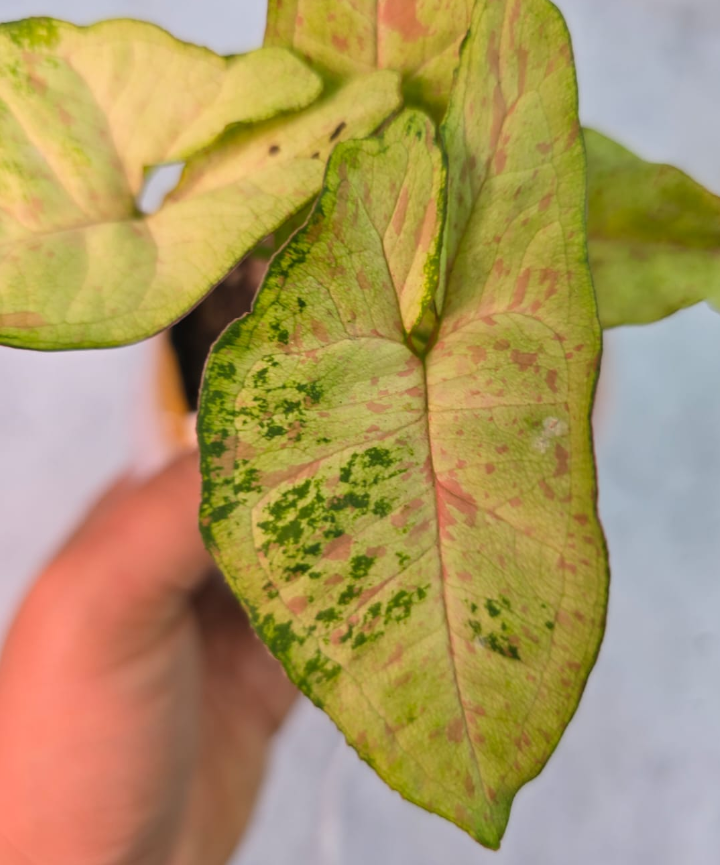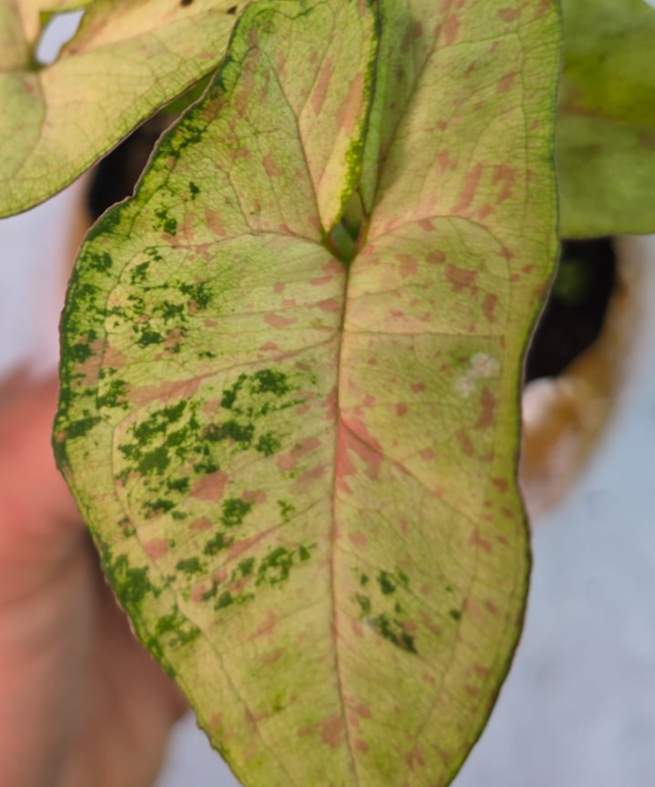 Cada hoja de este syngonio es una pequeña celebración del color natural. Con luz, paciencia y constancia, el patrón se intensifica y cambia con el tiempo.