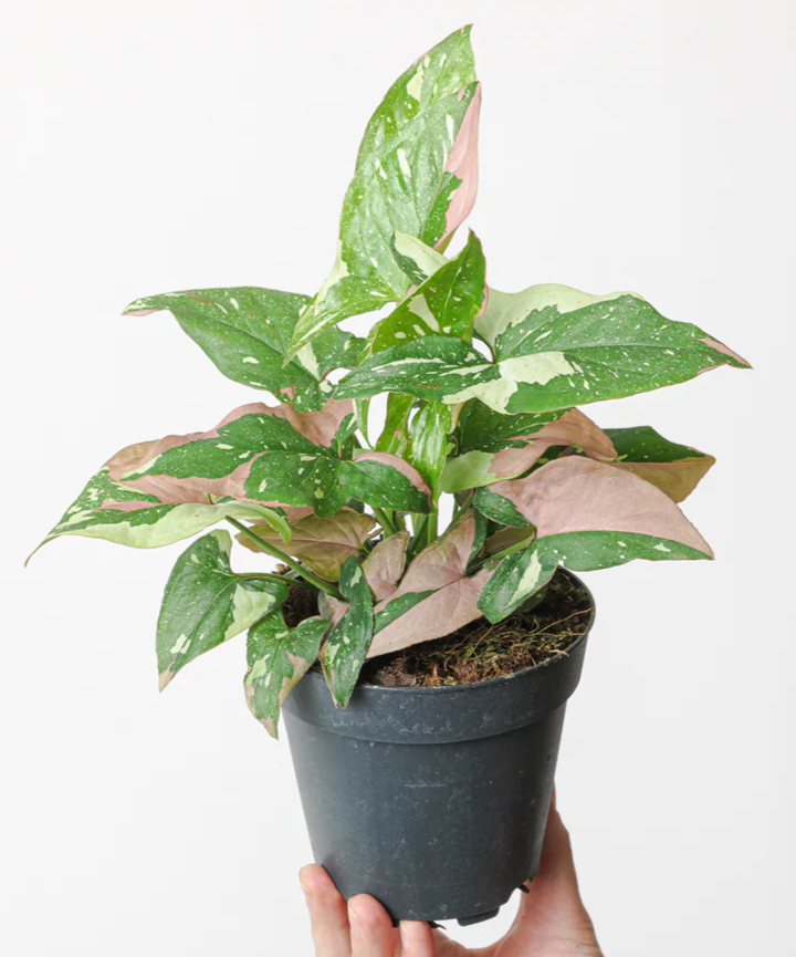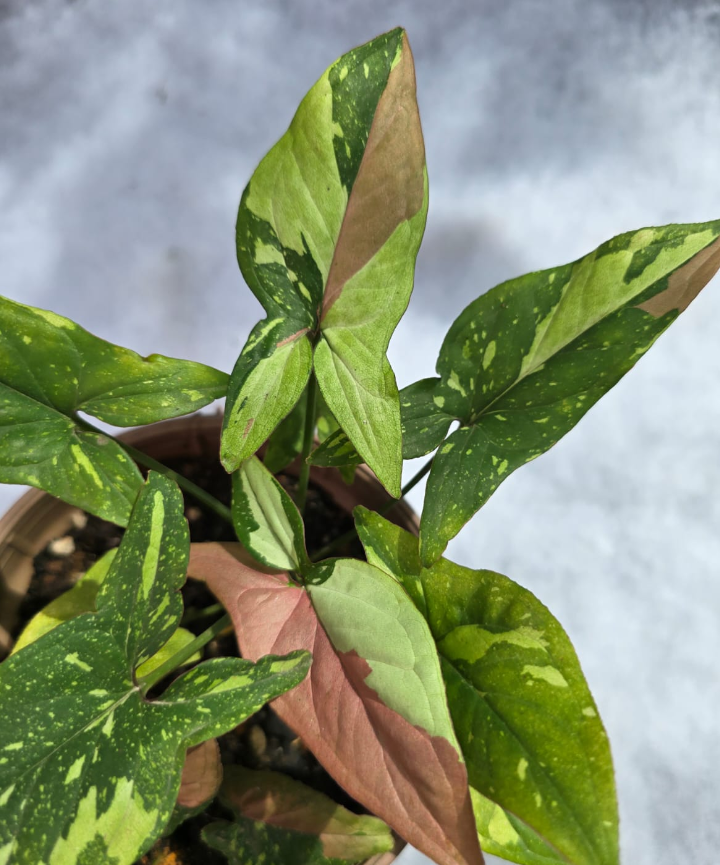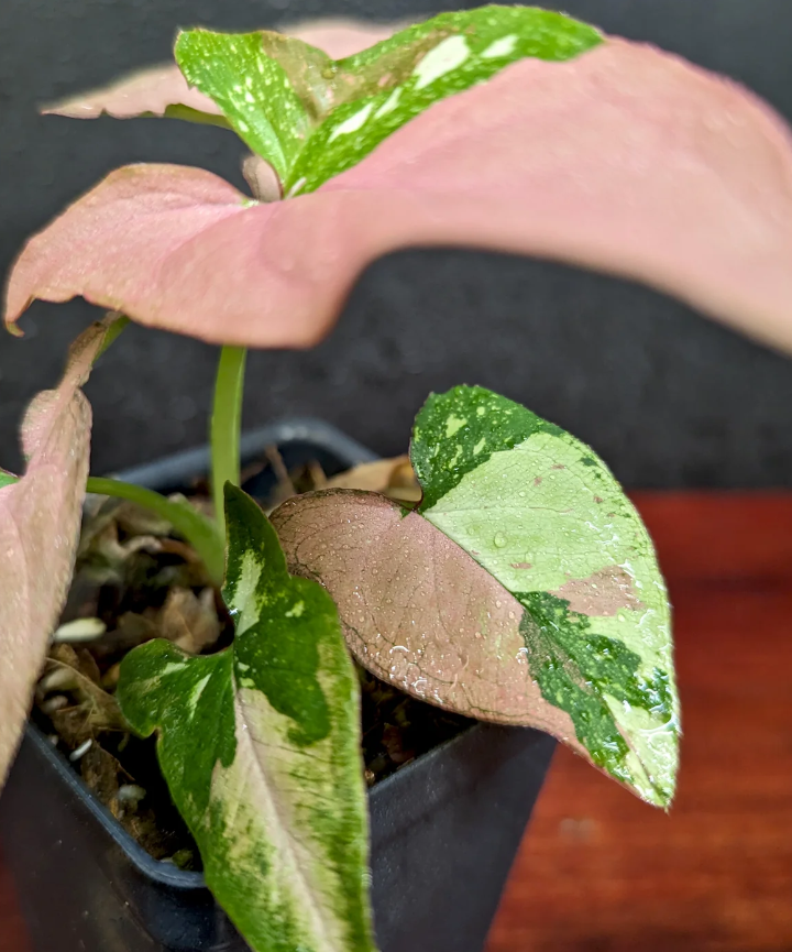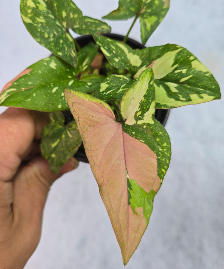 El Syngonium Red Spot Tricolor es una de las variedades más buscadas por coleccionistas. Su encanto está en la mezcla de tres tonos, verde, crema y rosa, que se combinan de manera única en cada hoja. Algunas muestran vetas delicadas, otras grandes bloques de color: ninguna es igual a otra.